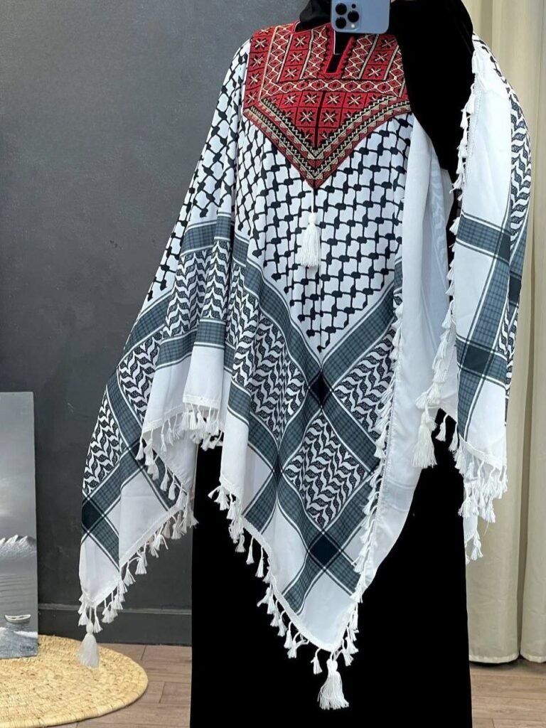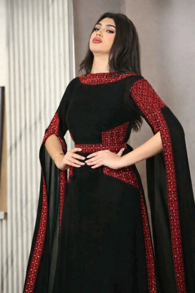 Style: Homewear Pattern: Traditional Description: Jalabiya with Arabic letters and traditional Eitamin embroidery on the chest and fringes Neck: Slightly high Collar Sleeve: Long and wide Waist: Hidden belt Length: 132cm Fabric Elasticity: Non-Stretch Fabric Texture: Cotton Viscose Washing Instructions: Low-temperature machine wash or dry cleaning