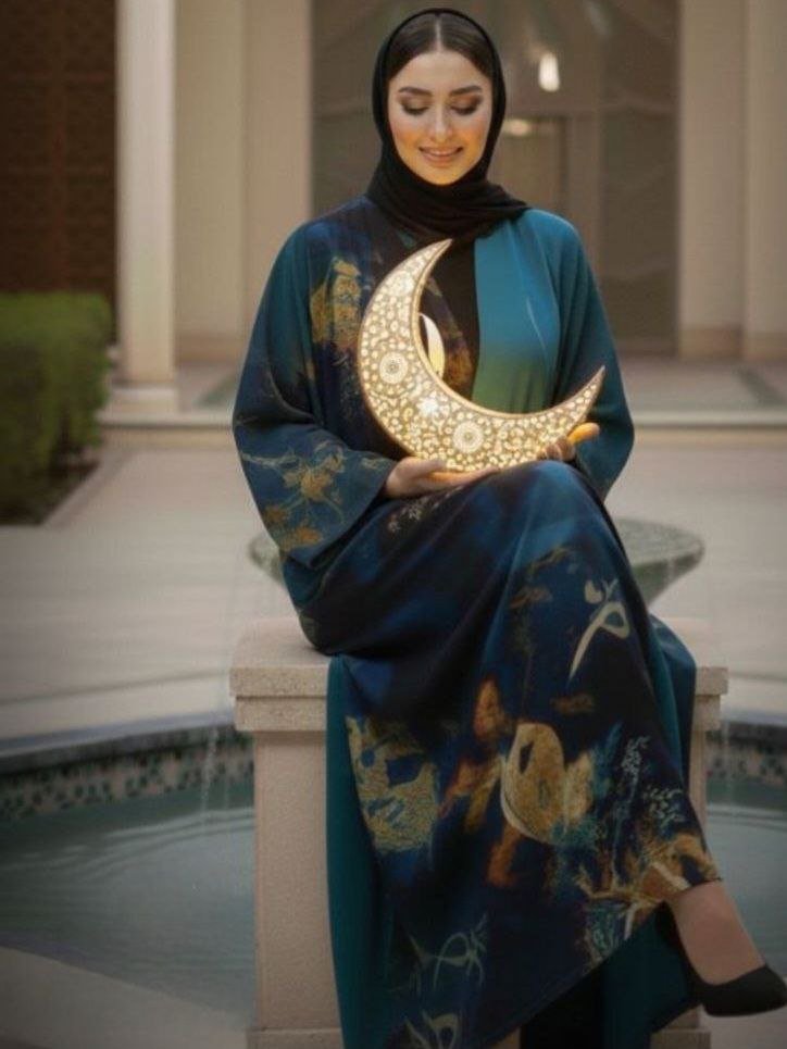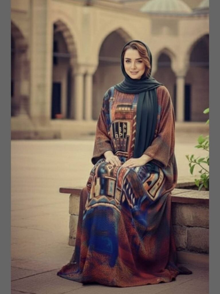 Style: Jellabiya 111 Pattern: Portrait Description:Â Â jellabiya print Portrait Neck: Round Collar Sleeve: Long and Wide Waist: Regular Length: 155cm Fabric Elasticity: Non-stretch Fabric Texture: Crepe