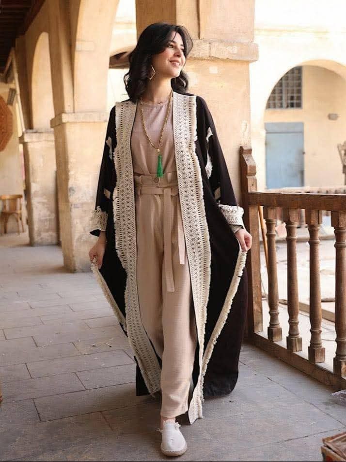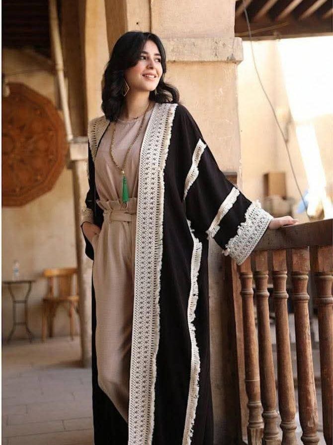 Style: Casual Pattern: Plain Description: Plain Open Abaya with side pocket and connected belt Neck: Formal collar Sleeve: Long and Wide Waist: External belt Length: 138 cm Fabric Elasticity: Non-stretch Fabric Texture: Linen& Jeans