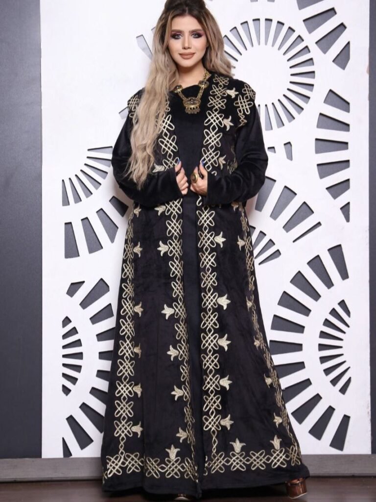 الطراز: شيك النمط: تطريز الوصف: قفطان قطعتين, فستان سادة كم طويل, بشت بدون كم مزين تطريز صرما على طول البشت العنق: ياقة دائرية الكم: فستان: طويل عادى / البشت: بدون كم الخصر: عادى الطول: 150سم مرونة القماش: متمدد نسيج القماش: مخمل