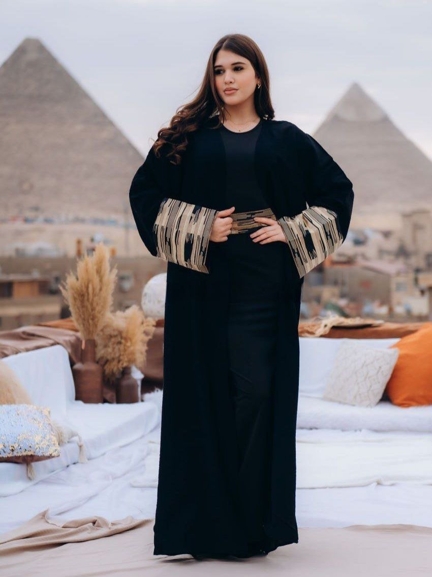 الطراز: كاجوال شيك النمط: تراثي الوصف: بشت مفتوح ربطة على الصدر مزين بخيوط الايتامين الكم: 1/2 كم واسع الخصر: عادي الطول: 155سم مرونة القماش: غير متمدد نسيج القماش: كريب