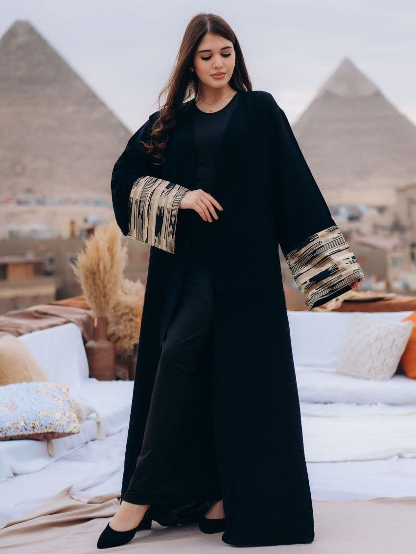 الطراز: كاجوال شيك النمط: تطريز الوصف: بشت مزين تطريز هندى وشراشيب على الصدر والكم الكم: 3/4 كم واسع الطول: 150سم مرونة القماش: غير متمدد نسيج القماش: رويال