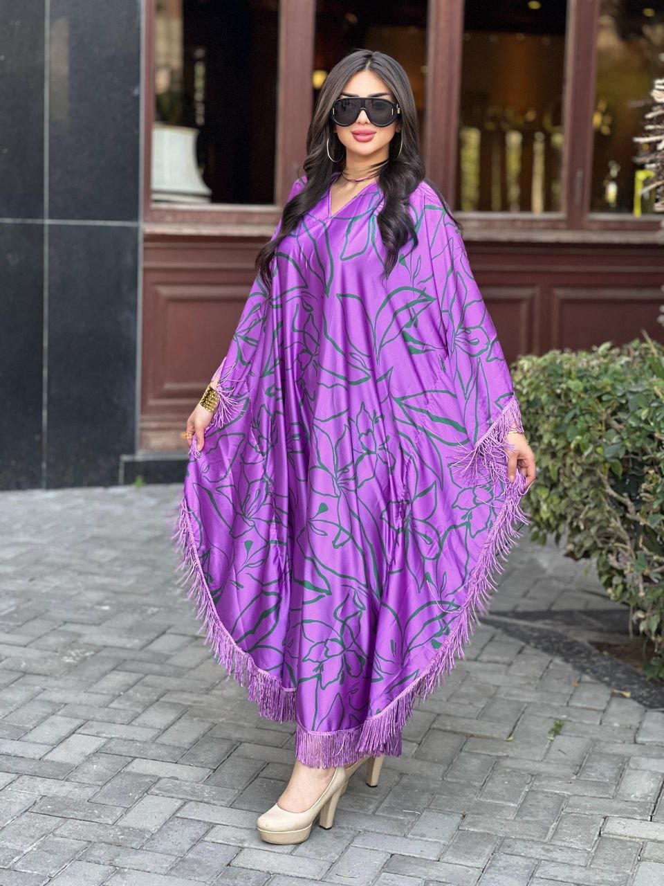 الوصف: جلابية شيك مزين طباعة أزهارو شراشيب على الكم والاطراف , الكم فراشه