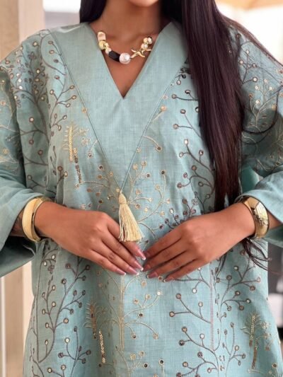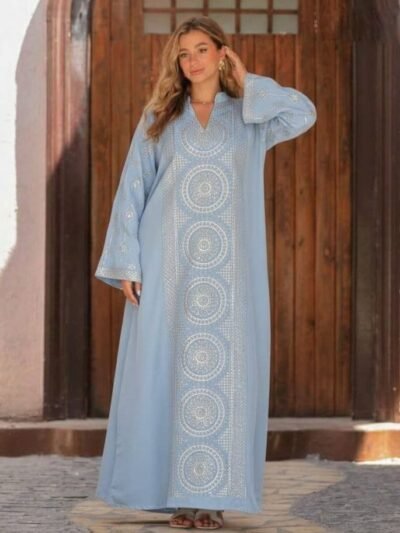 الطراز: جلابية النمط: هندسى الوصف: جلابية مزين ترترفضى على طول الفستان والكم العنق: ياقة مرتفعة قليلا الكم: طويل عادي الخصر: عادى الطول:150سم مرونة القماش: غير متمدد نسيج القماش: كتان