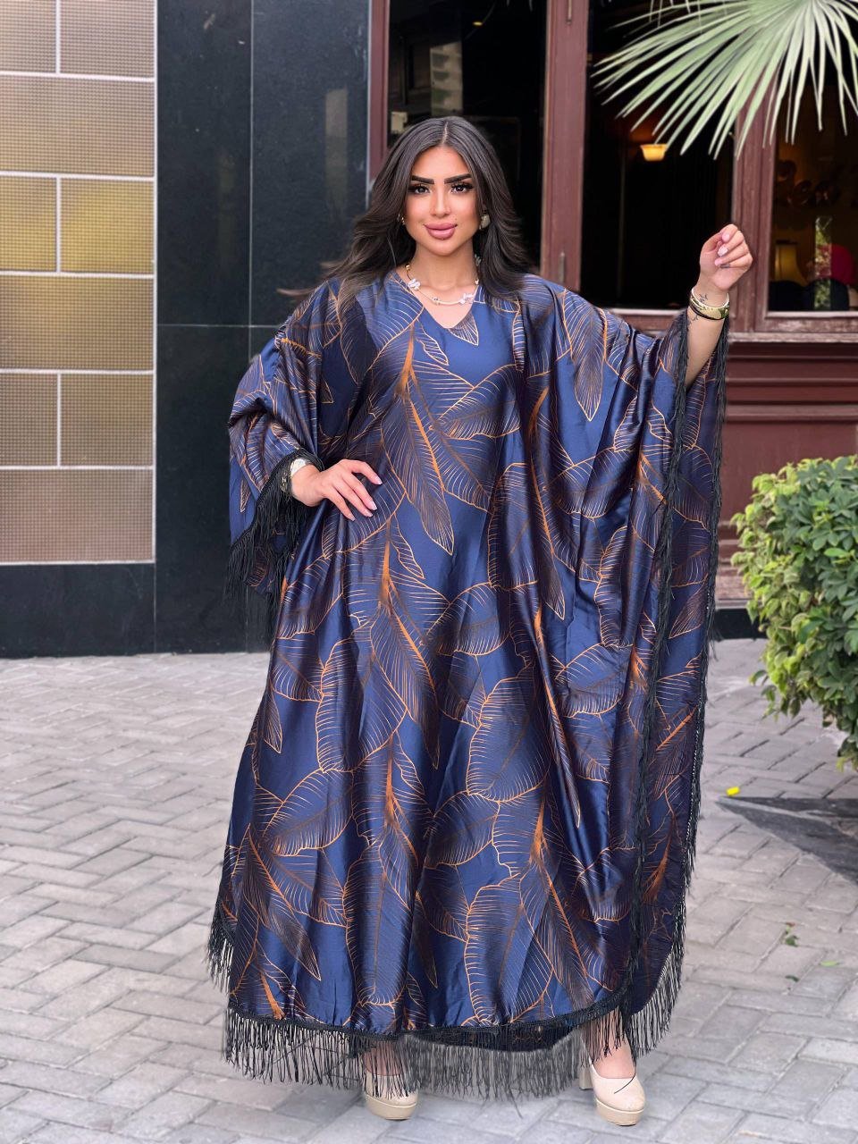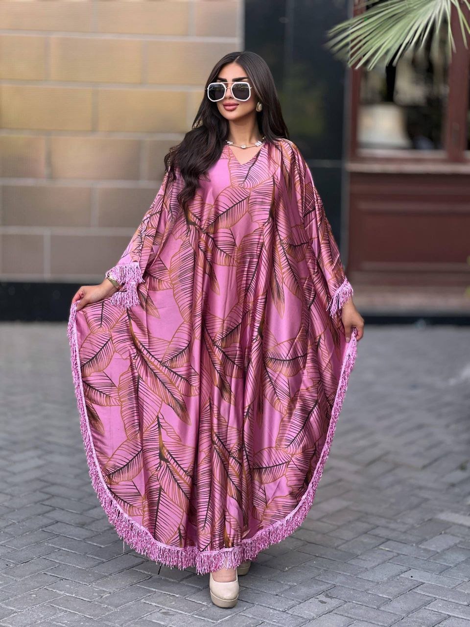 الوصف: جلابية مزين طباعة مشجرو شراشيب على الكم والاطراف , الكم فراشه