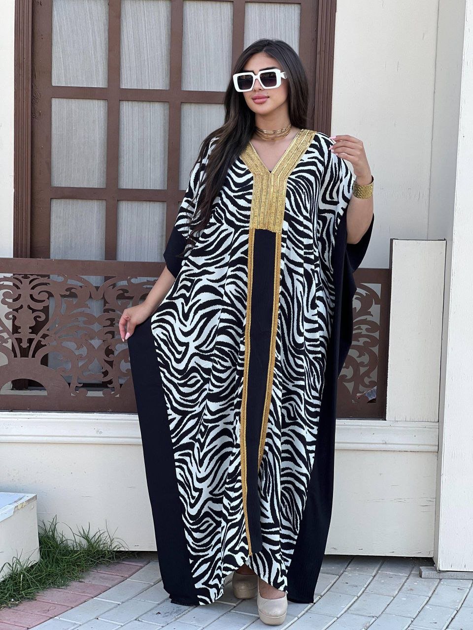 الوصف: جلابية عريضة و مريحه مزين طباعة زيبرا و شرايط ذهبي