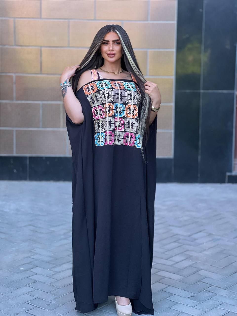 الوصف: جلابية عريضة حمالات مكشوف مزين طباعة عشوائي على الصدر