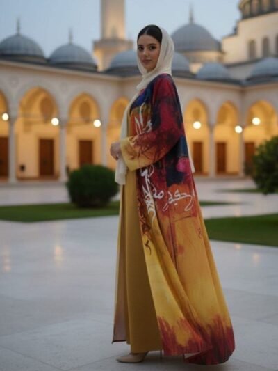 Style: Chic pattern: Embroidery Description: Two-piece abaya, long-sleeved lycra inner dress, chiffon Bisht dress with Ribbons on the Sleeves and Capuche, chiffon Hijab, Neck: Non Sleeve: Long with elastic cuffs Waist:Â Regular Length: 150cm Fabric Elasticity: Non-stretch Fabric Texture: Lycra and chiffon
