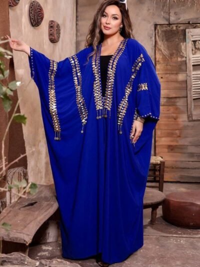 Style: Jalabiya Pattern: Geometric Description: Geometric Jalabiya decorated with silver Sequins along the dress and sleeves Neck: Slightly High Collar Sleeve: Regular long Waist: Regular Length: 150cm Fabric Elasticity: Non-stretch Fabric Texture: Linen