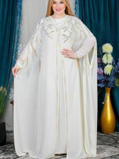 Style: Chic Pattern: Random Description: 3-Piece Kaftan, Long Sleeve Serma Embroidery Dress with Back Belt, Sleeveless Sheer Cape Serma Embroidered, Outer Belt Embroidered Serma Neck: Slightly High Collar Sleeve: Long Wide Waist: Back Belt and Outer Belt Length: 150cm Fabric Elasticity: Non-stretch Fabric Texture: Crepe Washing Instructions: Low-temperature machine wash or dry clean