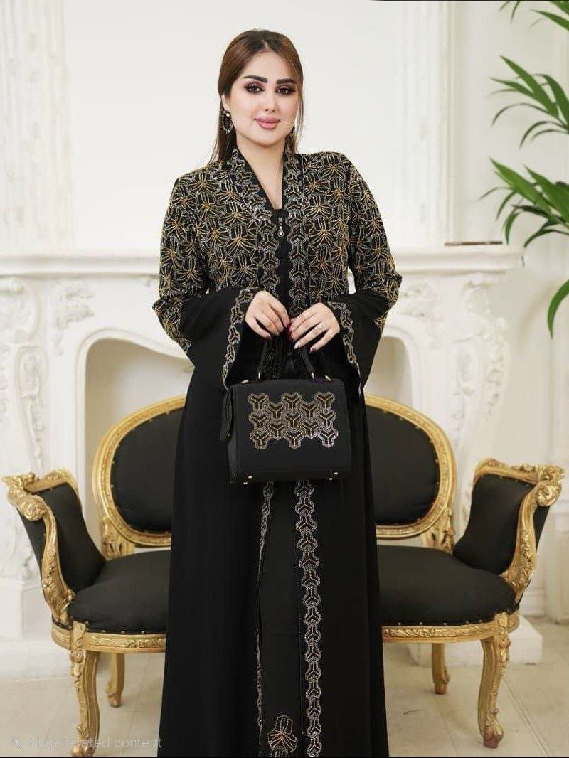Description: ِِAbaya decorated with Strass and zipper along the length of the Abaya, Lycra pants decorated with Strass with elastic waist , Chiffon Hijab decorated with Strass, Separate belt, bag