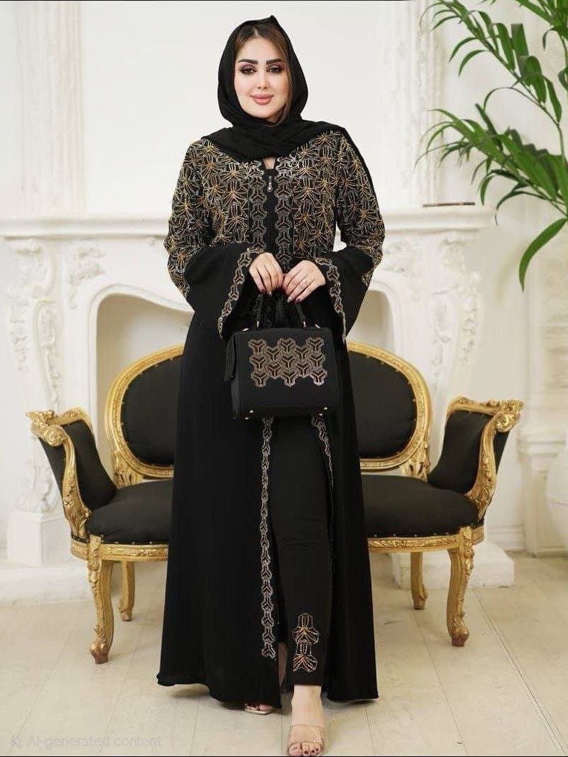Style: Chic Pattern: Geometric Description: ِِAbaya decorated with Strass and zipper along the length of the Abaya, Lycra pants decorated with Strass with elastic waist , Chiffon Hijab decorated w... read more