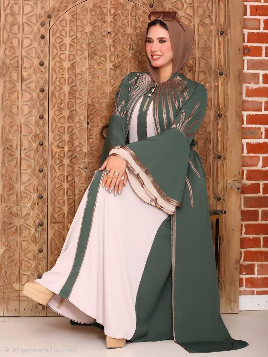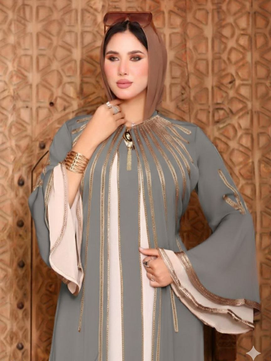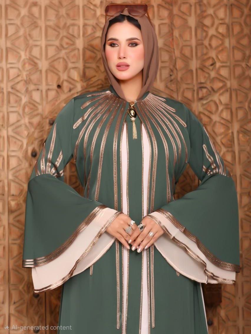 Abaya, strass, ribbons, Brooch on the chest, External belt, Silk, Chic