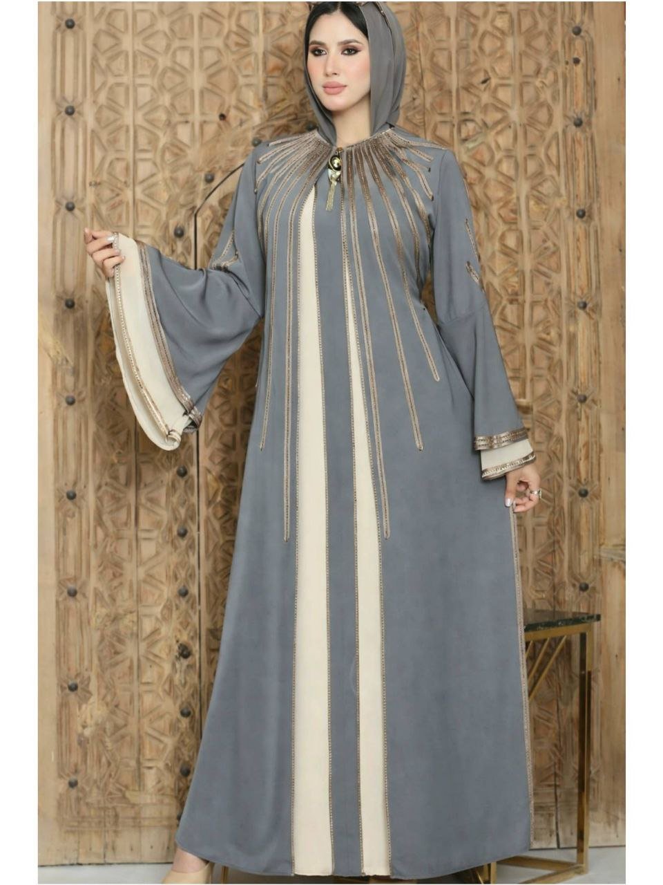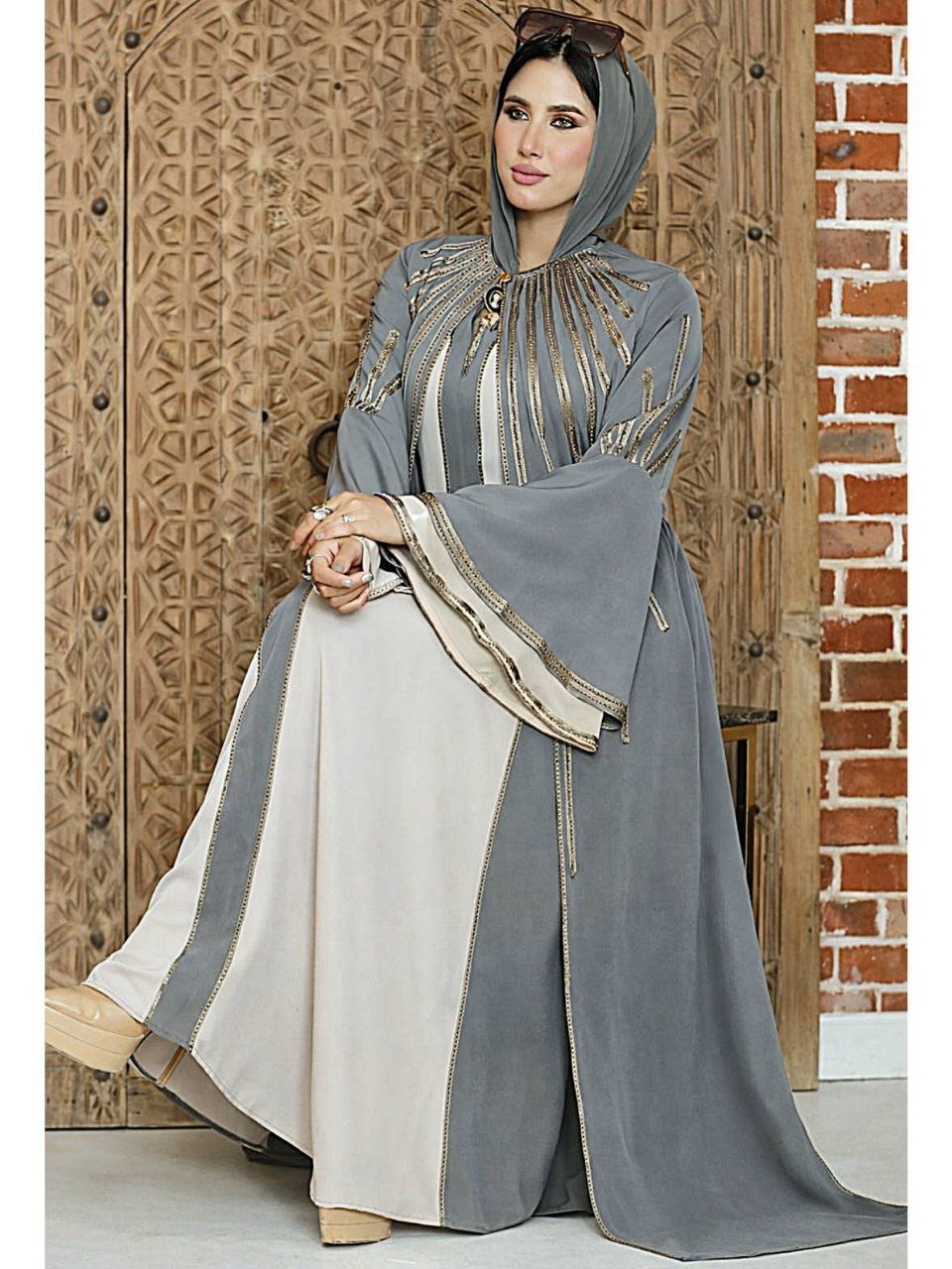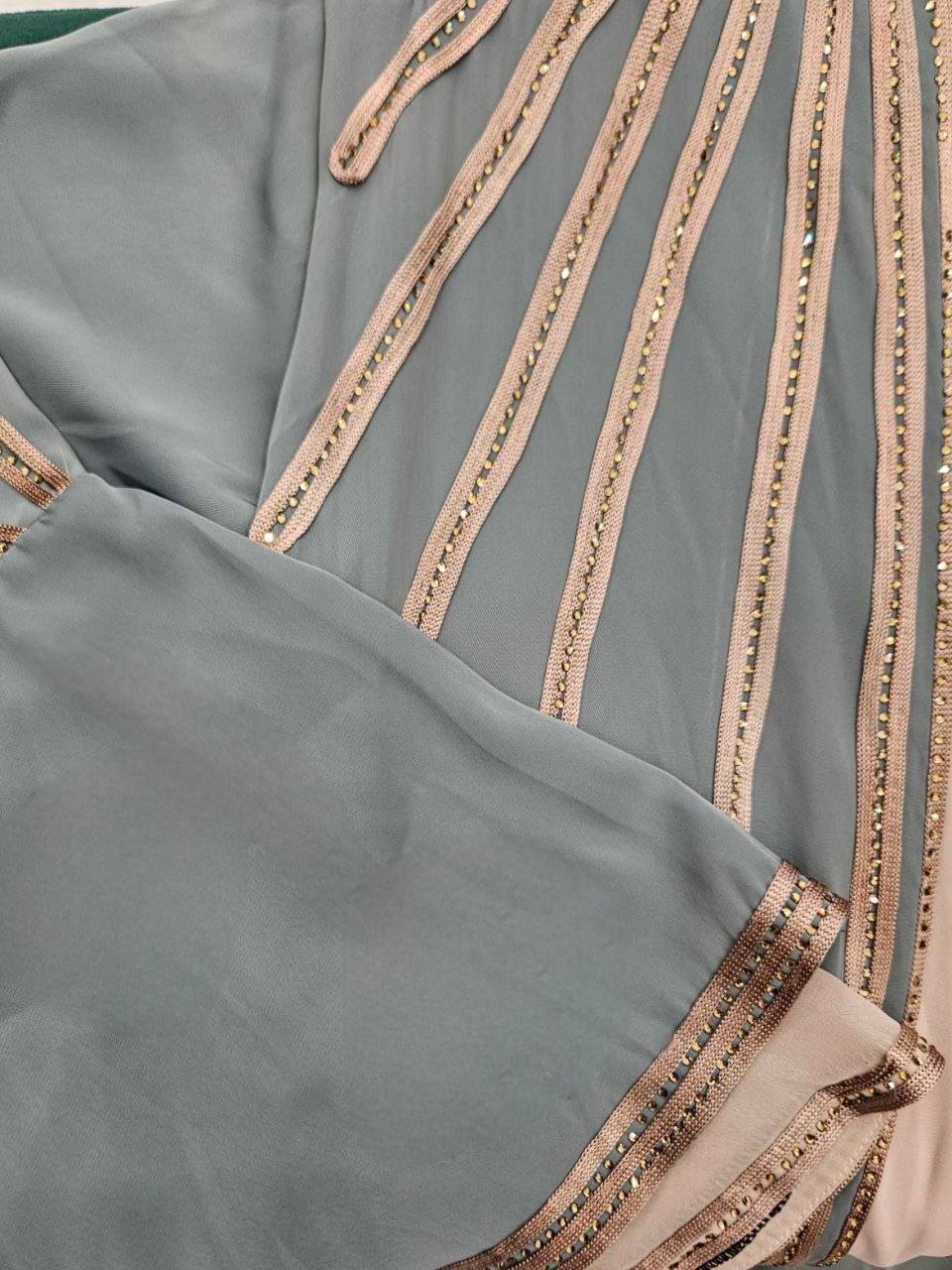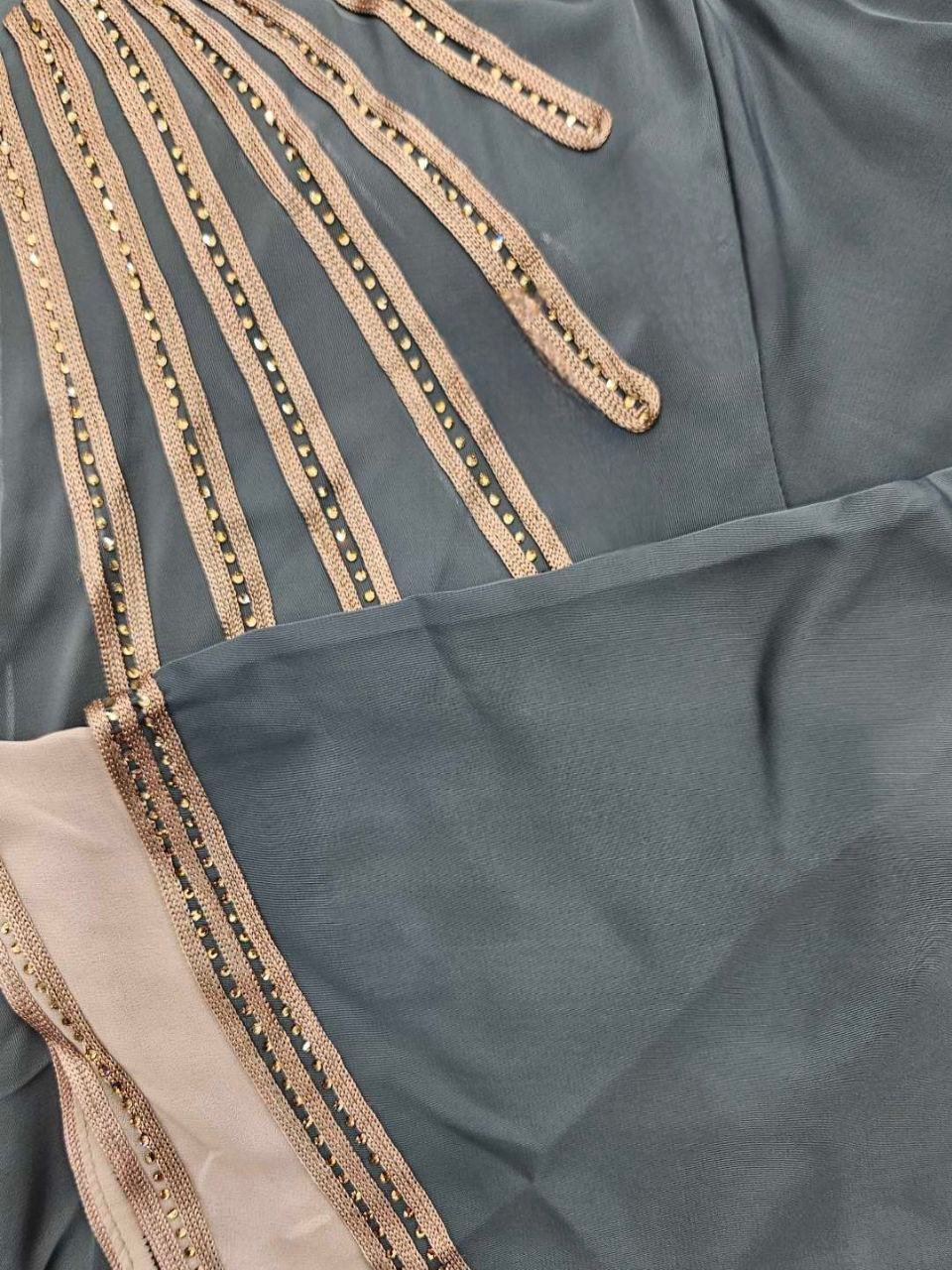 Description: Abaya embroidered with strass and ribbons, Brooch on the chest, Chiffon hijab, External belt