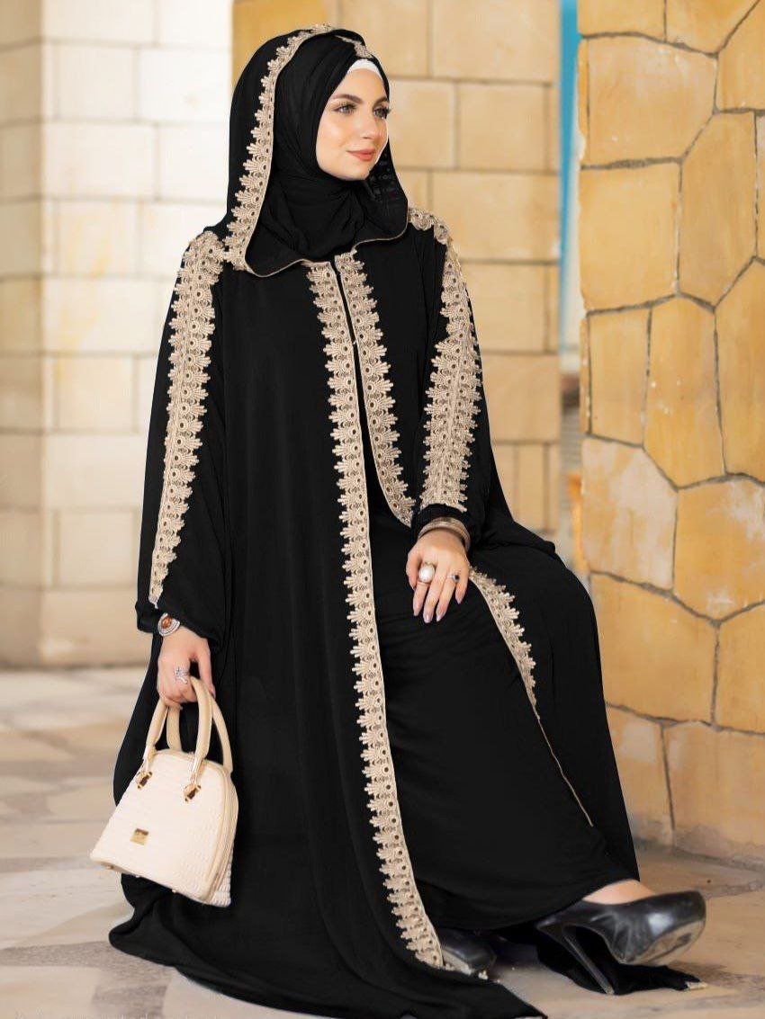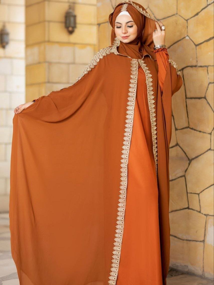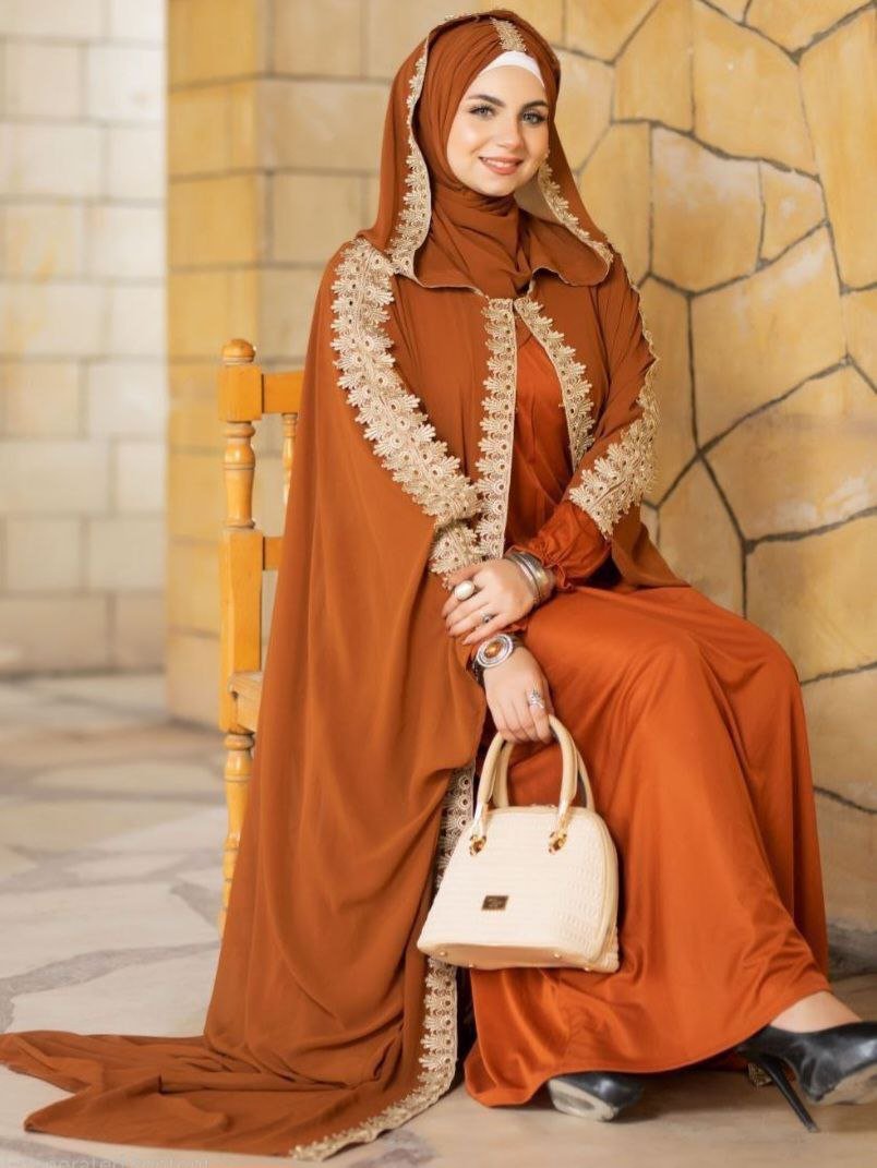 Description: Two-piece abaya, long-sleeved lycra inner dress, chiffon Bisht dress with Ribbons on the Sleeves and Capuche, chiffon Hijab,