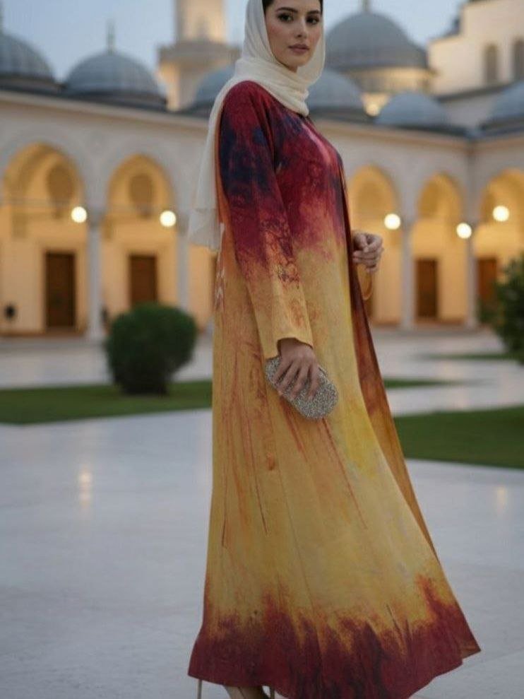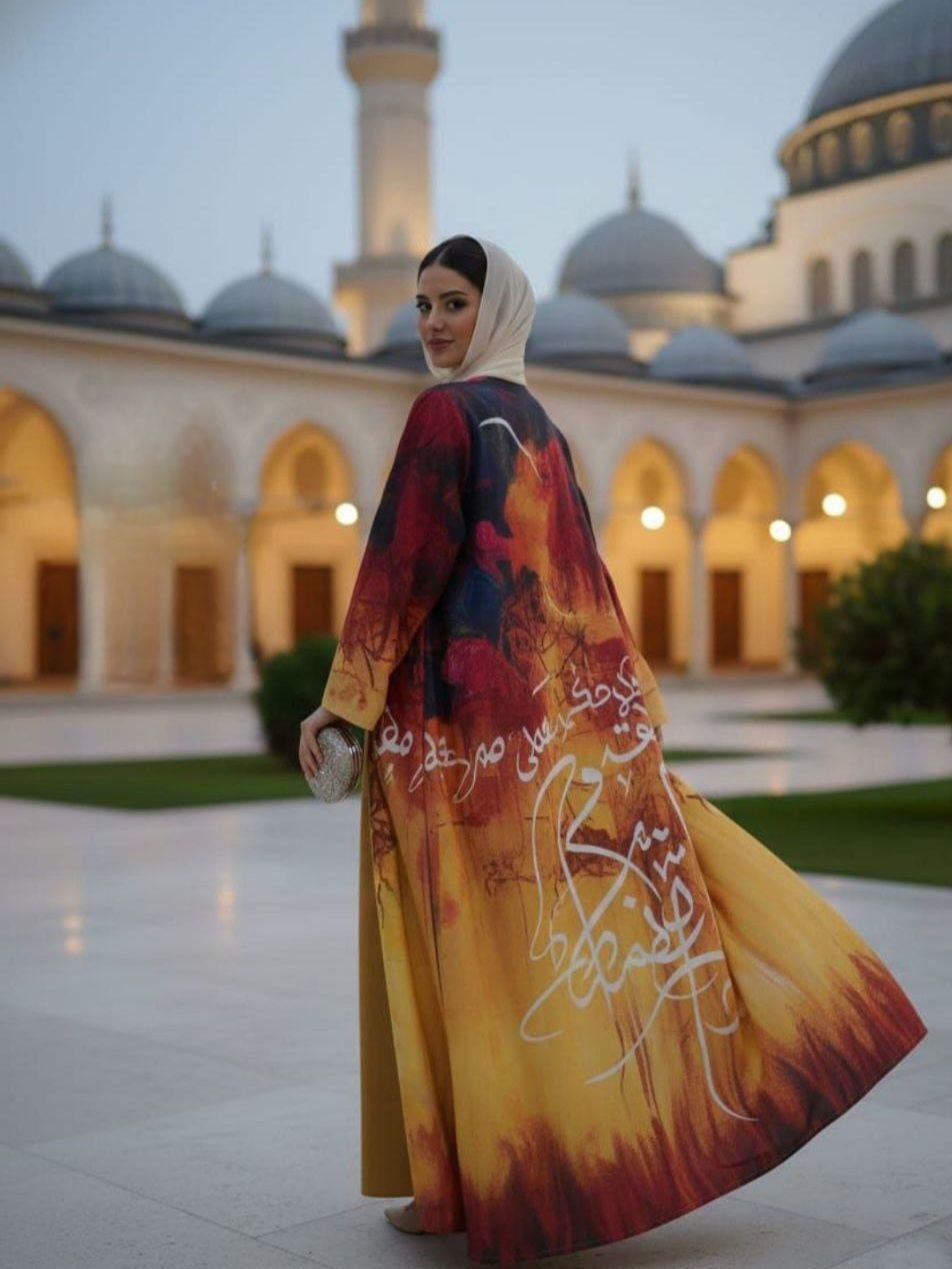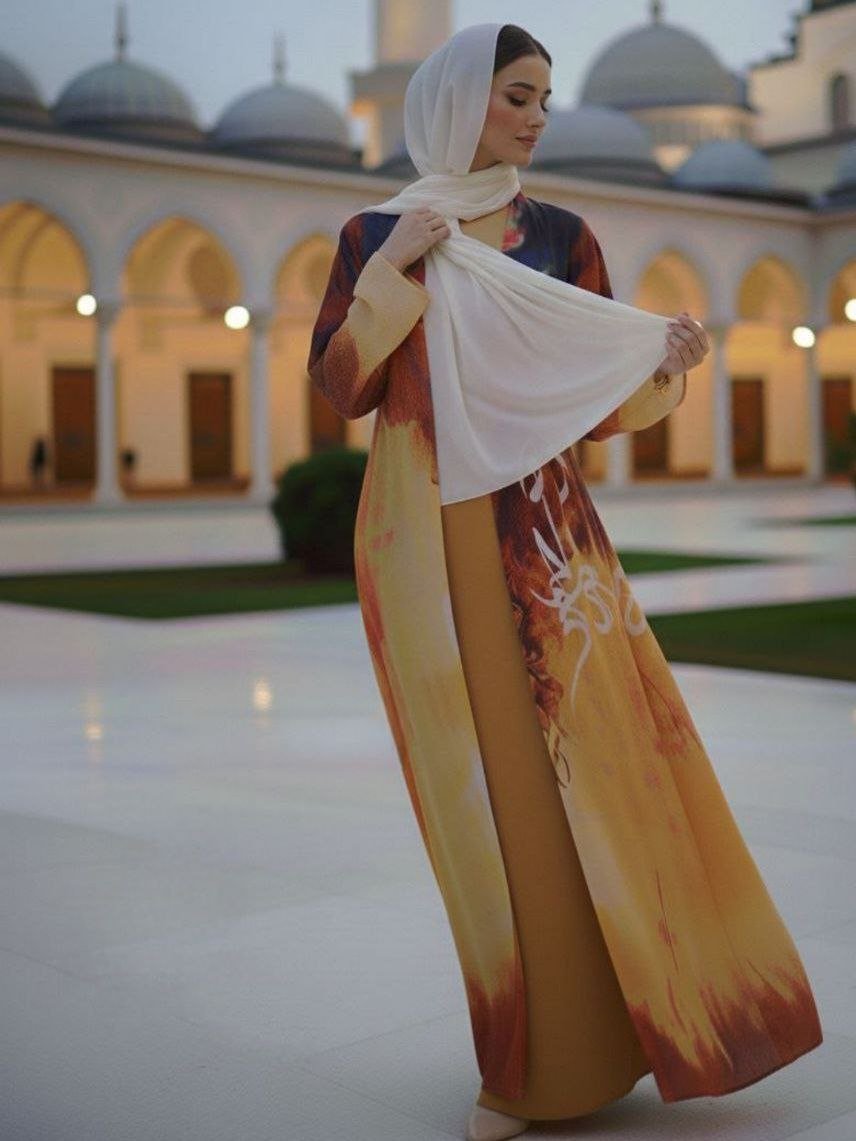 Style: Casual Pattern: Traditional Description: Open cardigan with Arabic letters print Sleeve: 1/2 wide sleeves Length: 130 cm Fabric Elasticity: Slightly stretchy Fabric Texture: Cotton Washing Instructions: Low-temperature machine wash or dry clean