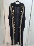 Style: Chic Pattern: Random Description: Jalabiya with dense cord embroidery, Fringe on the chest, Adjustable Inner Belt Neck: V-Collar Sleeve: 3/4 sleeve Waist: Adjustable Inner Belt Length: 145cm Fabric Elasticity: Non-stretch Fabric Texture: Crepe Washing Instructions: Hand wash or low-temperature dry clean