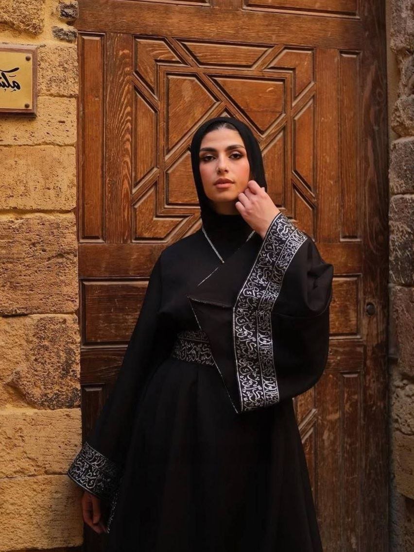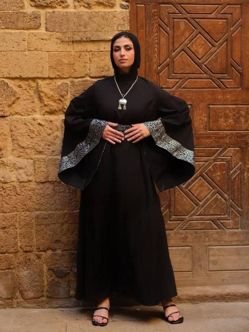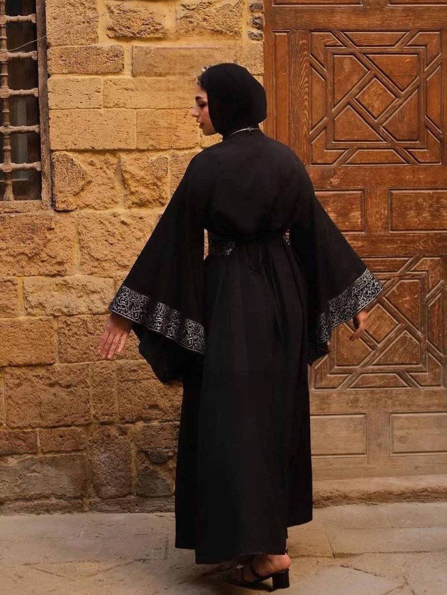 Description: Dress decorated with silver shiny ribbon, Separate belt