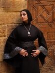 Description: Dress decorated with silver shiny ribbon, Separate belt