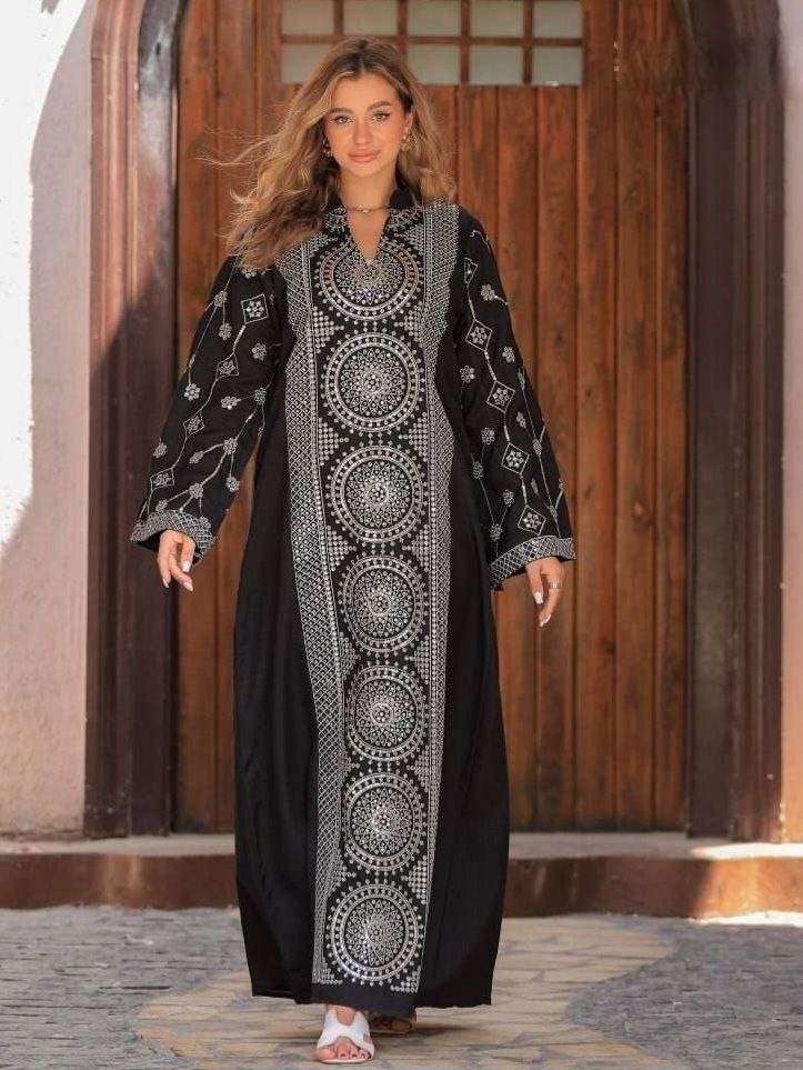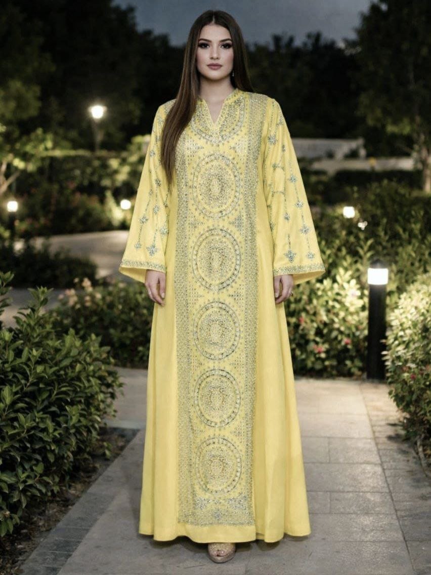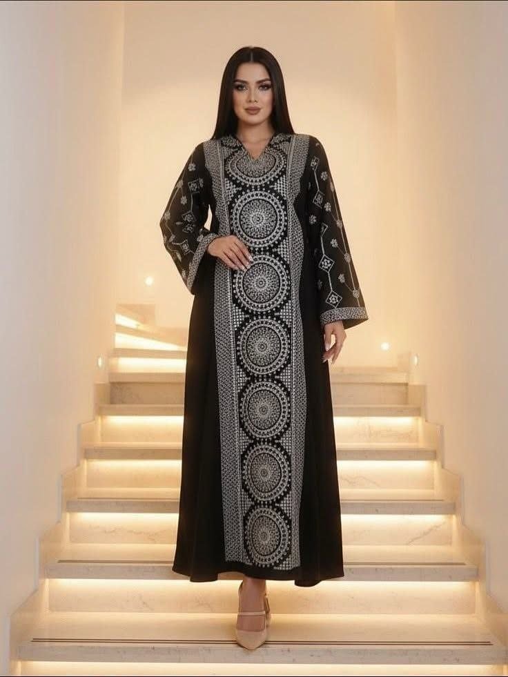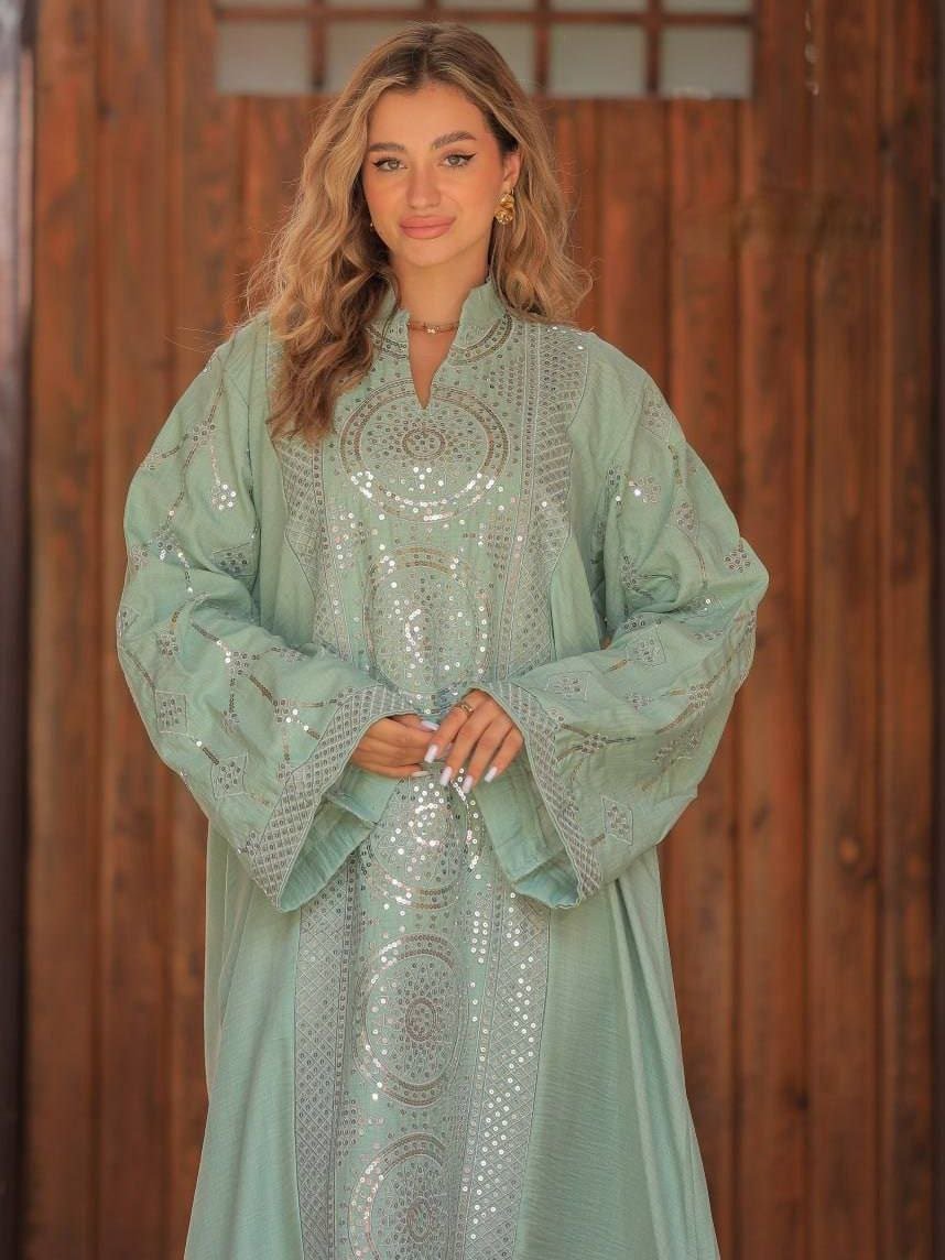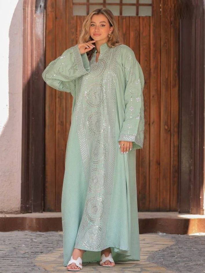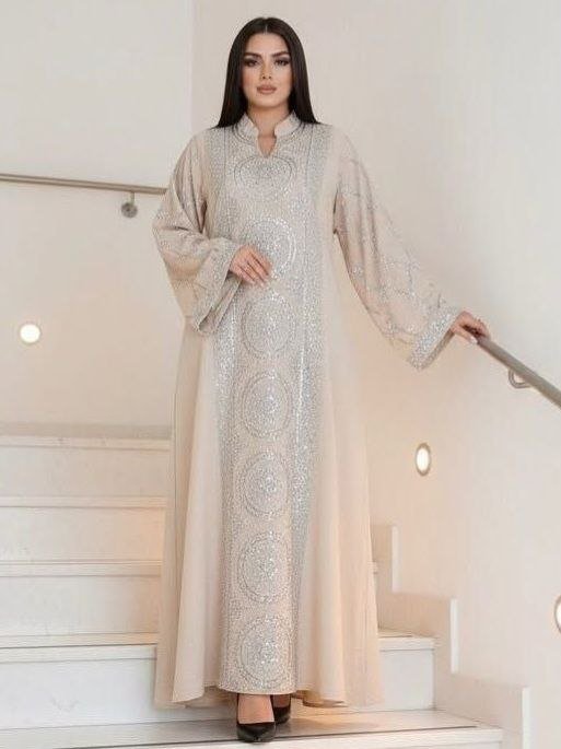 Description: Geometric Jalabiya decorated with silver Sequins along the dress and sleeves