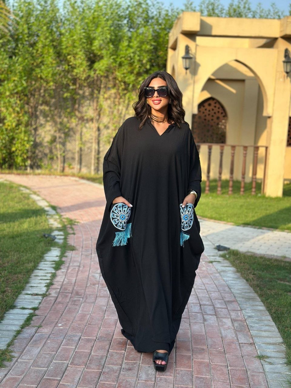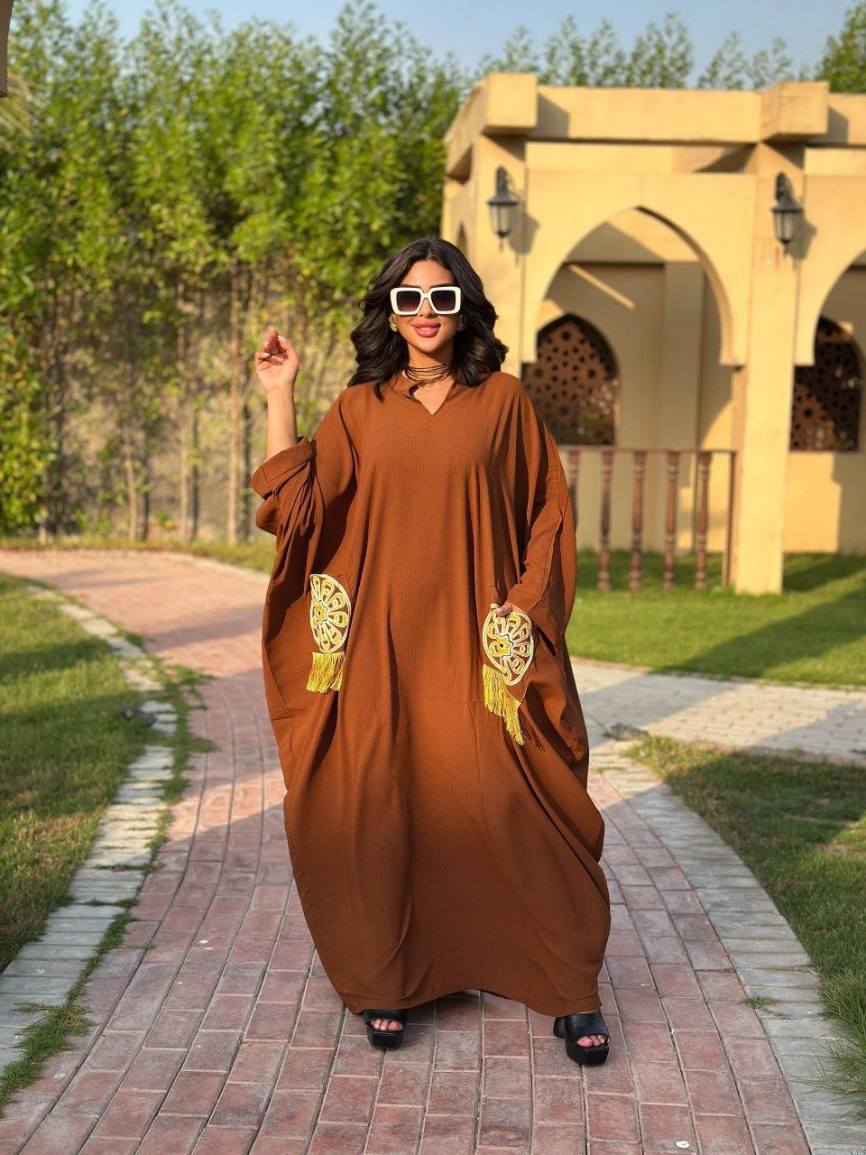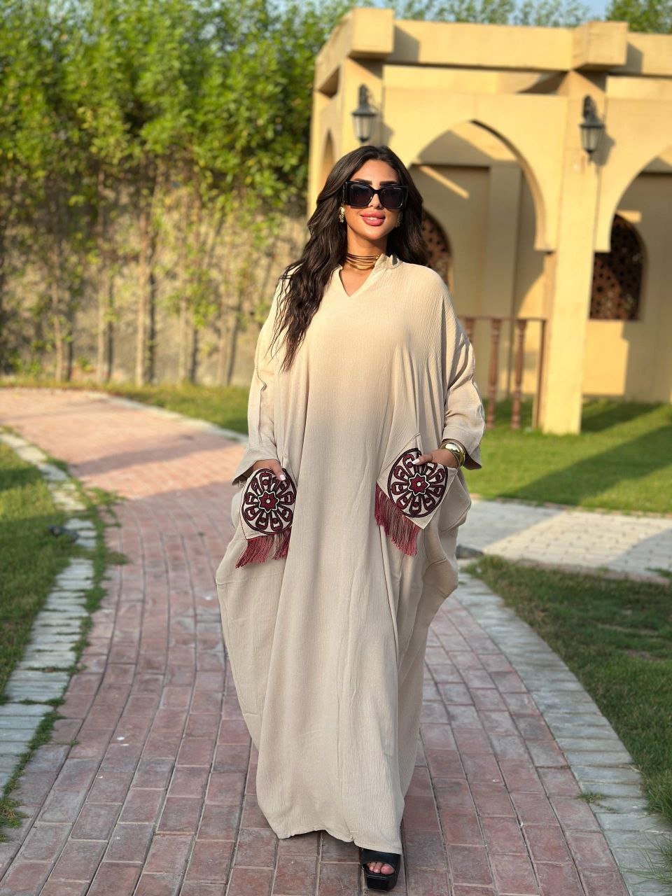 Description: Jalabya decorated with Wool Embroidery and Tassels on the pockets and back, Wide Style
