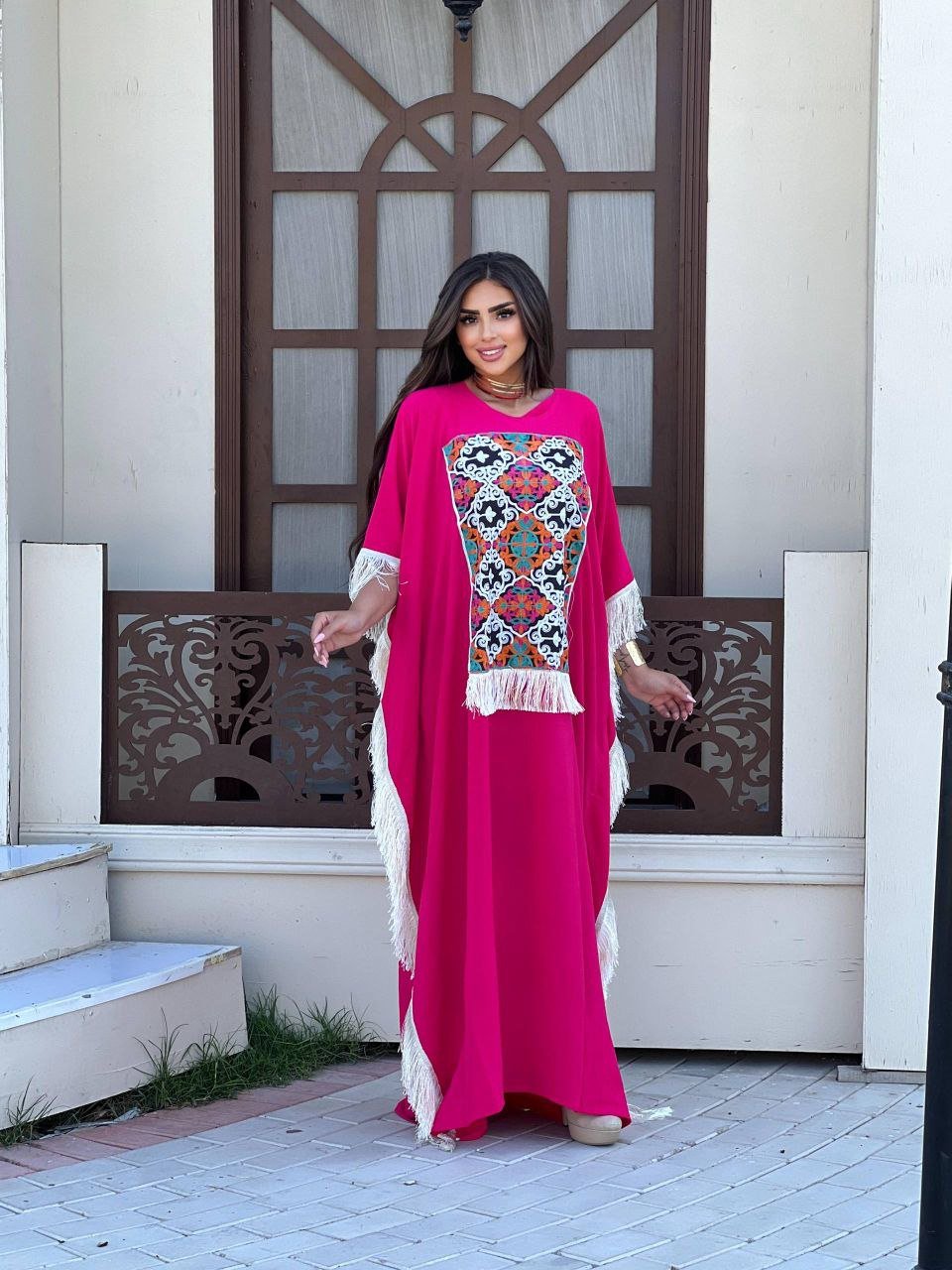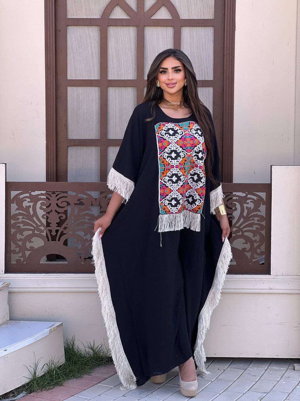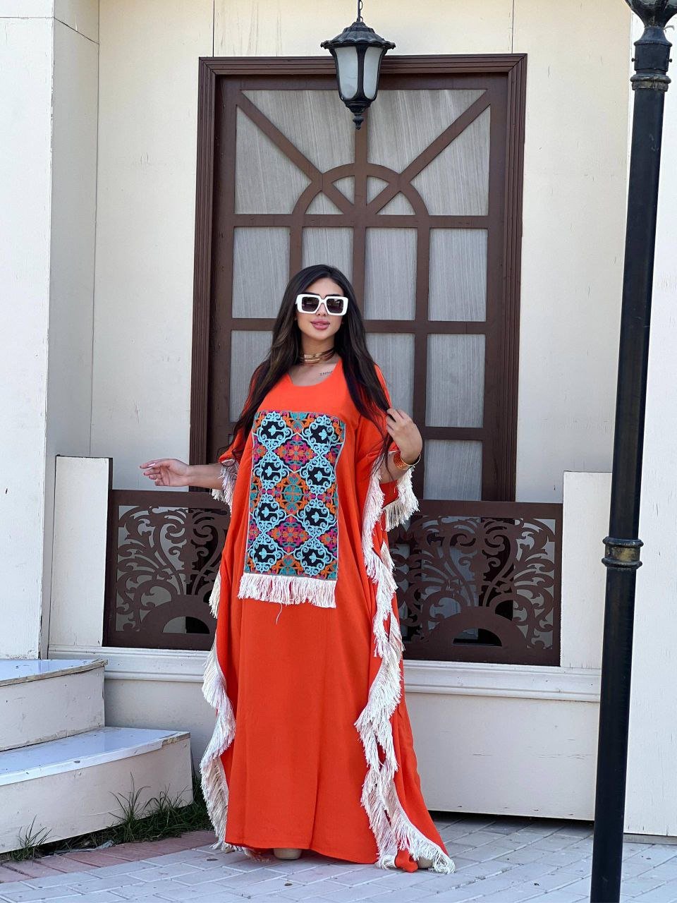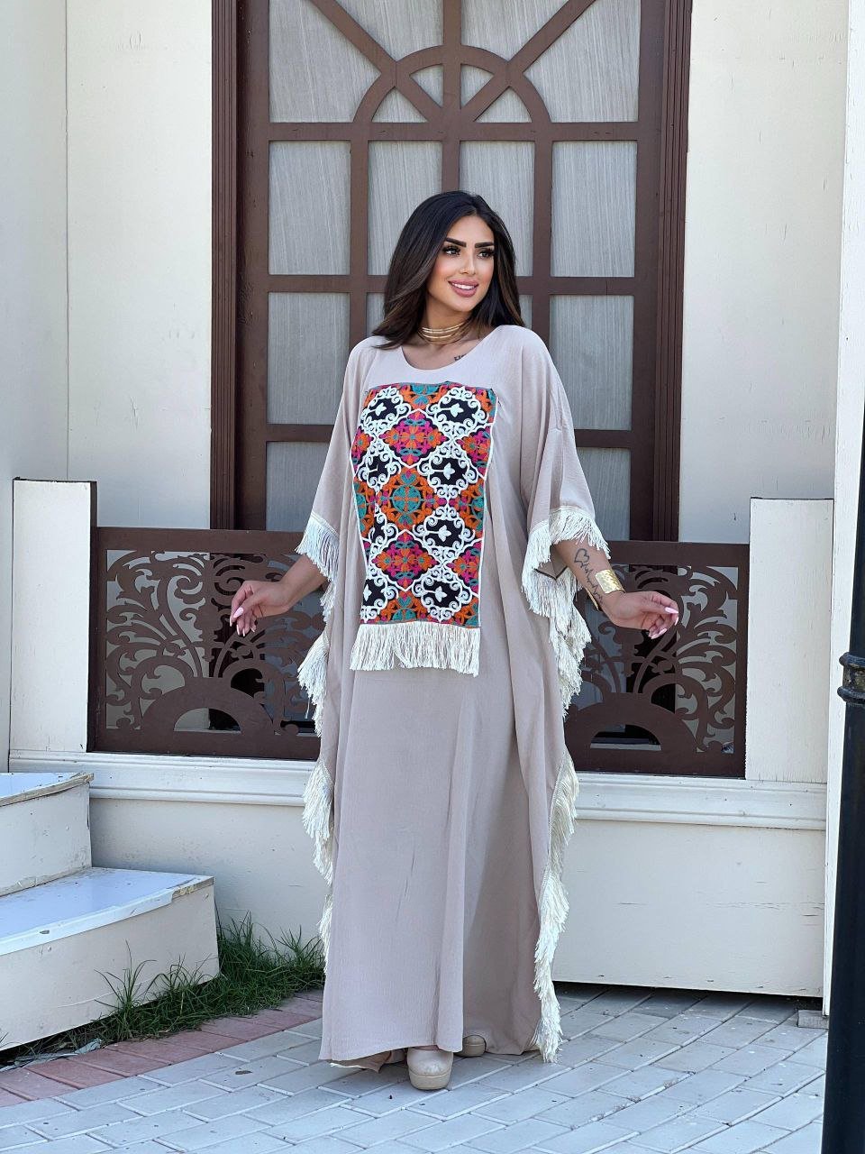 Description: Jalabiya decorated with random wool thread embroidery and Tassels on the edges, Butterfly Style