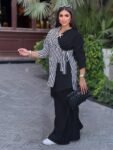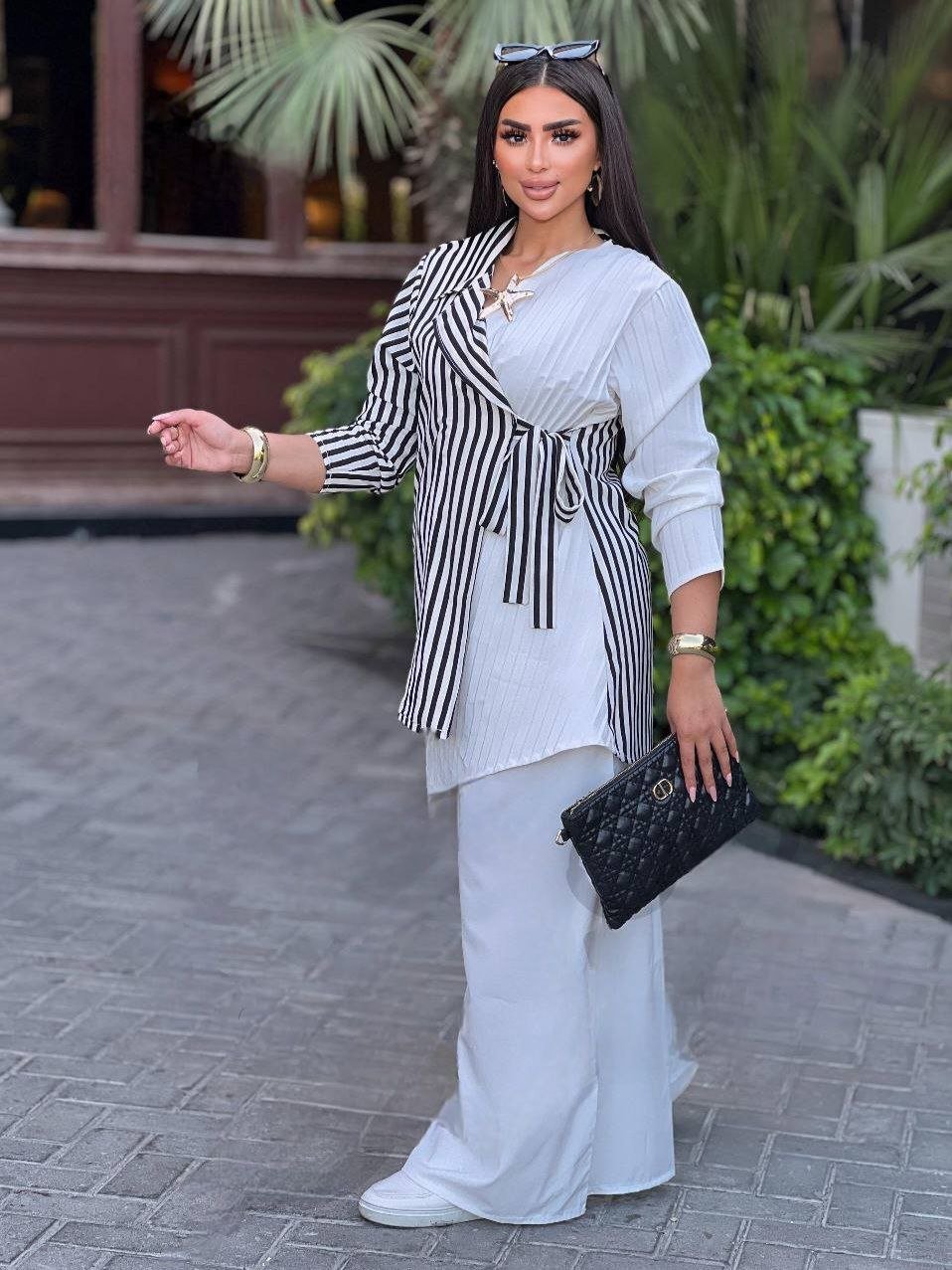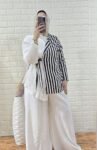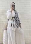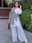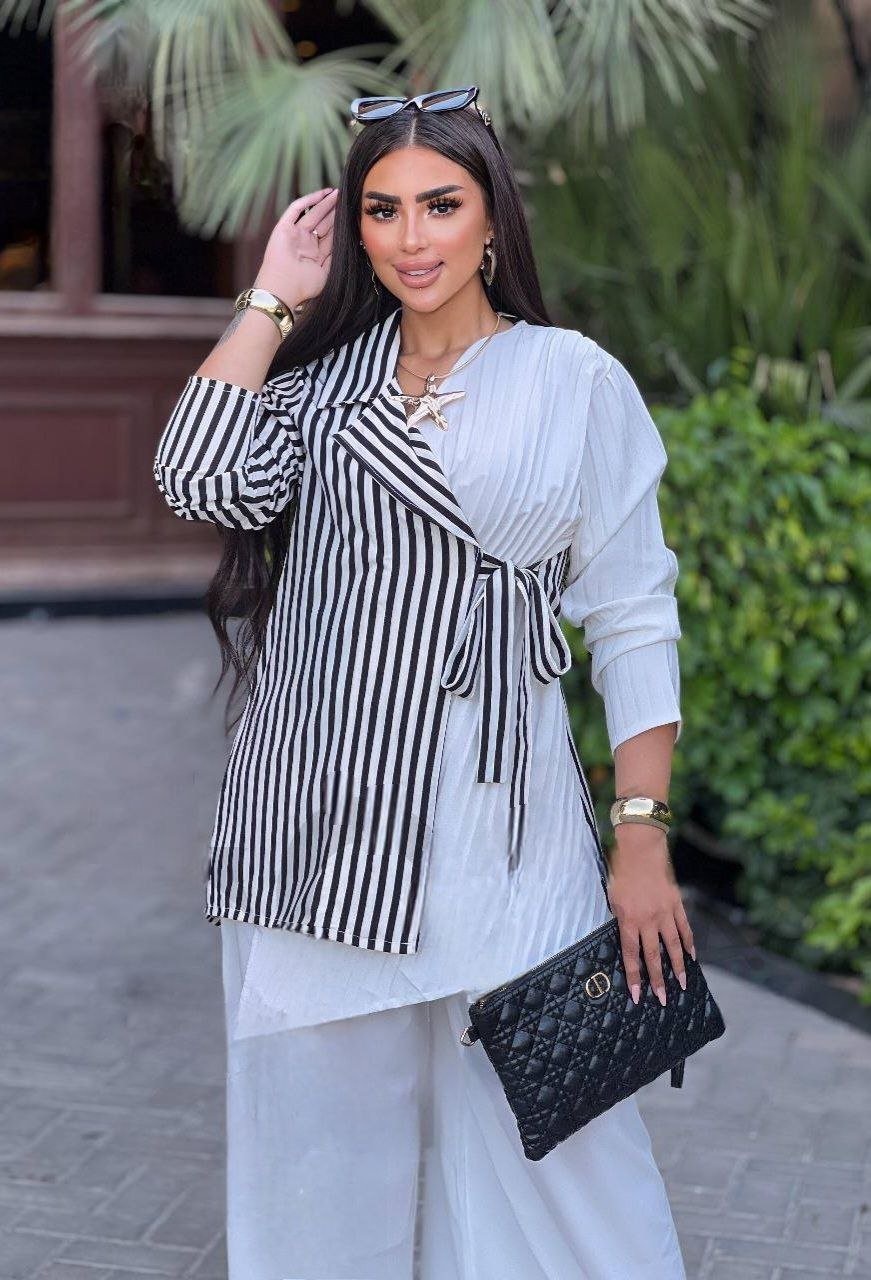 Description: Set 2 pieces, wide elastic waist pants with pockets, Half- Striped and Half – pleated Wrap Shirt